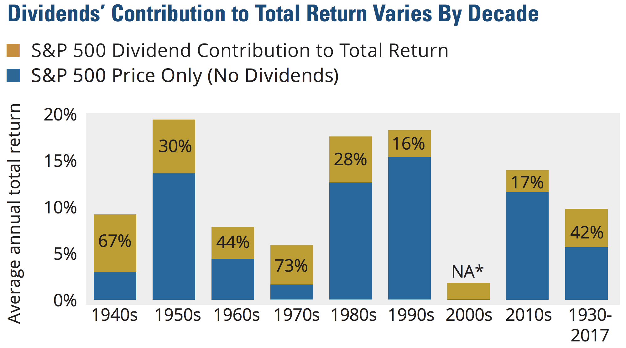 As you might have noticed in the bar chart above, the relative importance of dividends varied from one decade to the next depending on the strength of the market’s price performance. During periods when stock prices stagnate, such as the 1970s and 2000s, dividends make up a greater portion of the market’s return than capital appreciation.